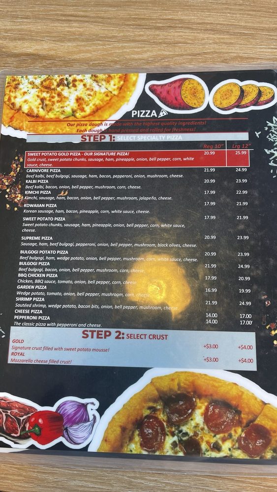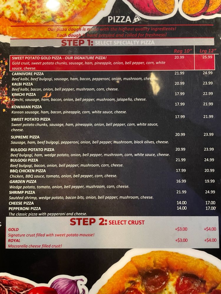 Beef bulgogi, ham, wedge potato, white sauce, onion, bell peppers, corn and cheese. Our pizza dough is made with the highest quality.