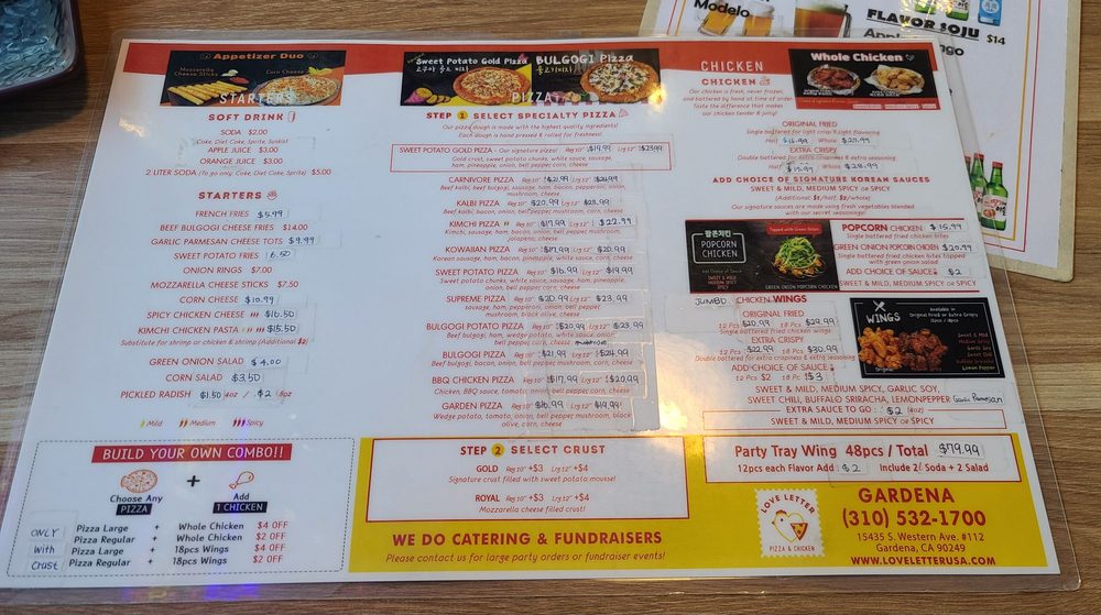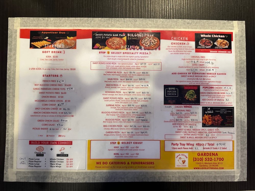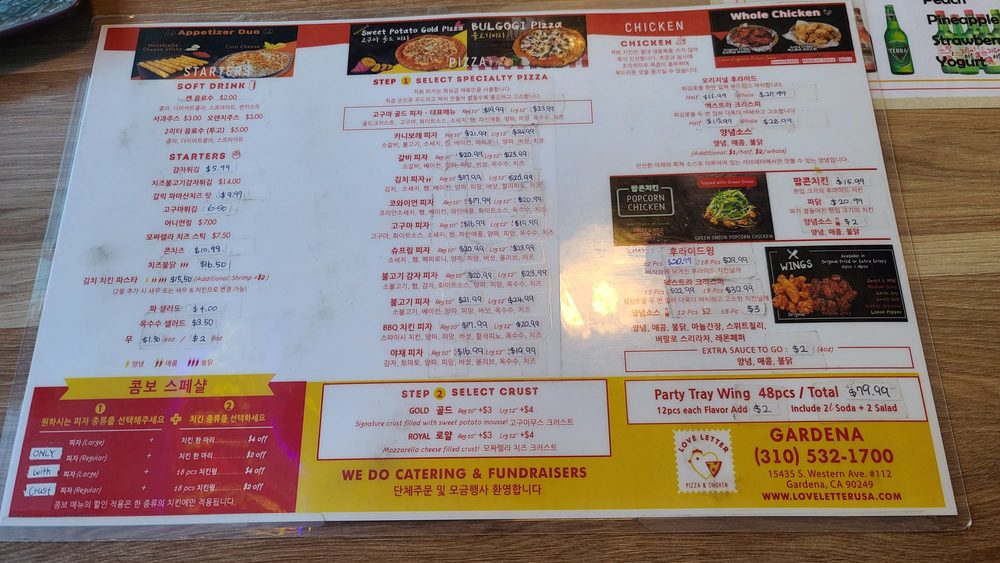 Love Letter Pizza & Chicken, located in Gardena, CA, offers a diverse menu of starters, wings, and pizzas that incorporate Korean flavors. The restaurant provides various utilities such as delivery, takeout, and free Wi-Fi. Customers rave about the crispy and flavorful chicken, especially the sweet potato pizza, bulgogi potato pizza, and chicken wings. Reviewers mention the excellent service, with some highlighting the fusion style pizzas and crispy fried chicken as must-tries. The ambiance at Love Letter Pizza & Chicken exudes a welcoming and vibrant atmosphere, reminiscent of Seoul. With a focus on quality ingredients and unique flavor combinations, this restaurant is a top choice for those seeking a delicious and satisfying dining experience.